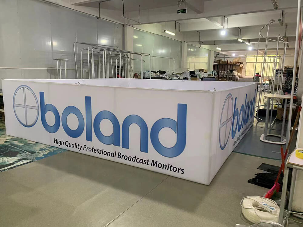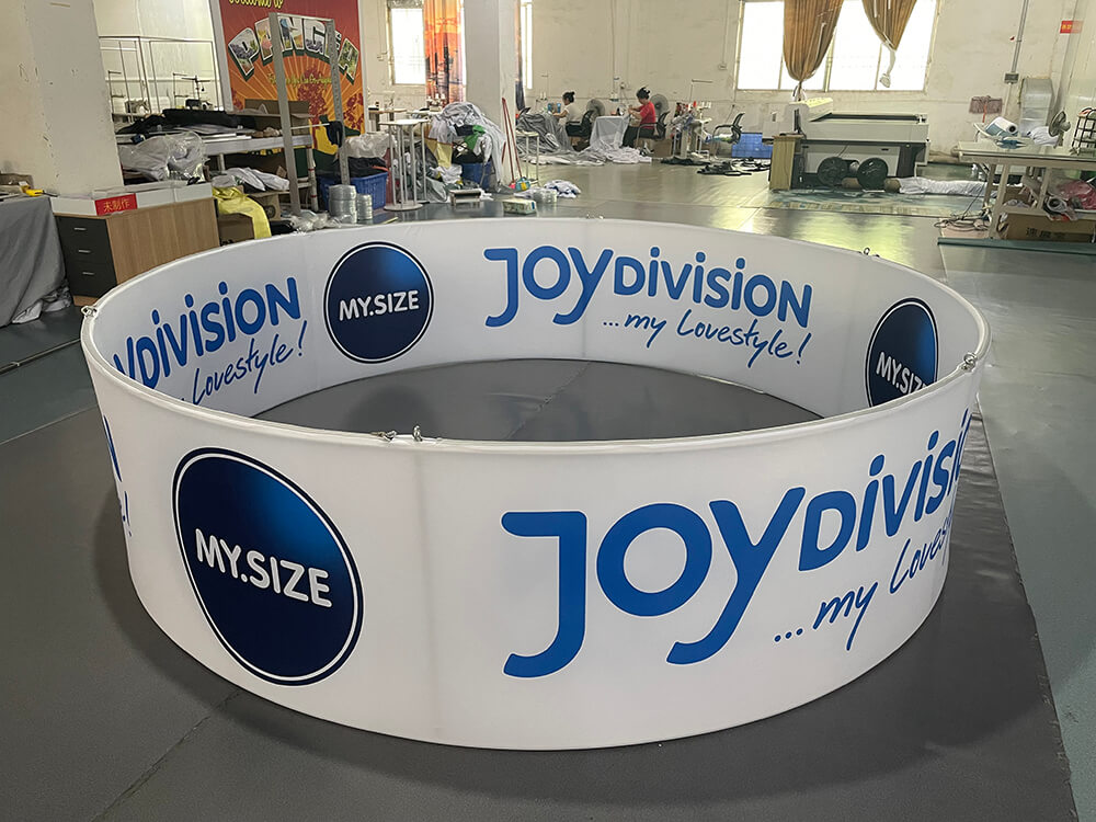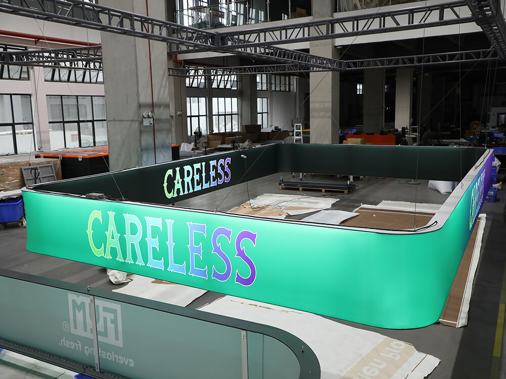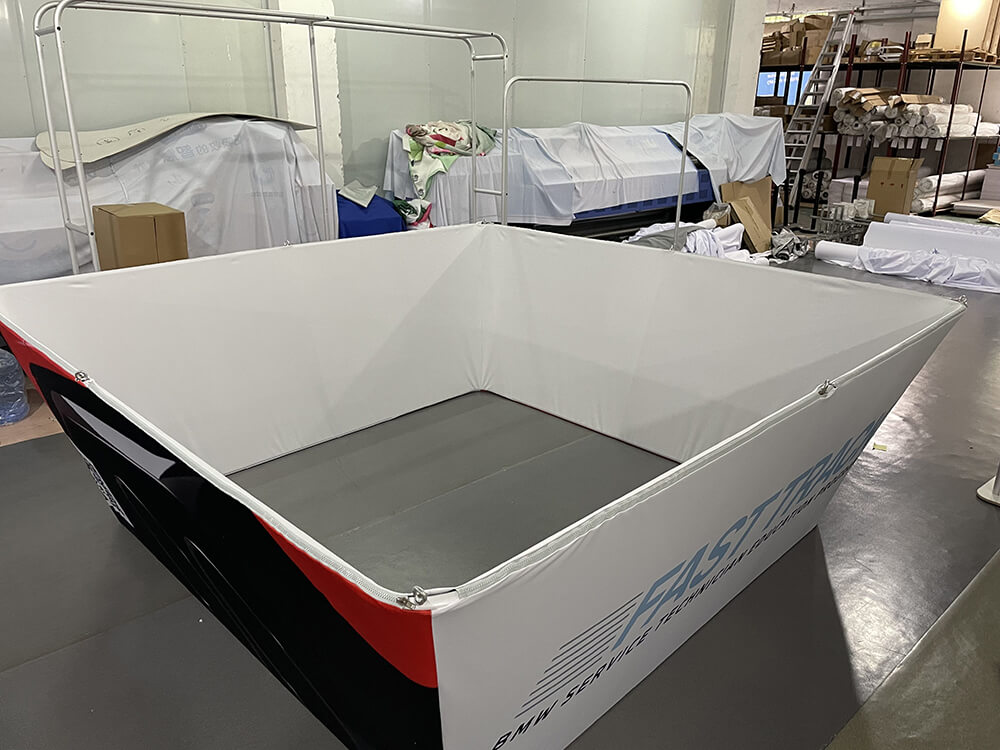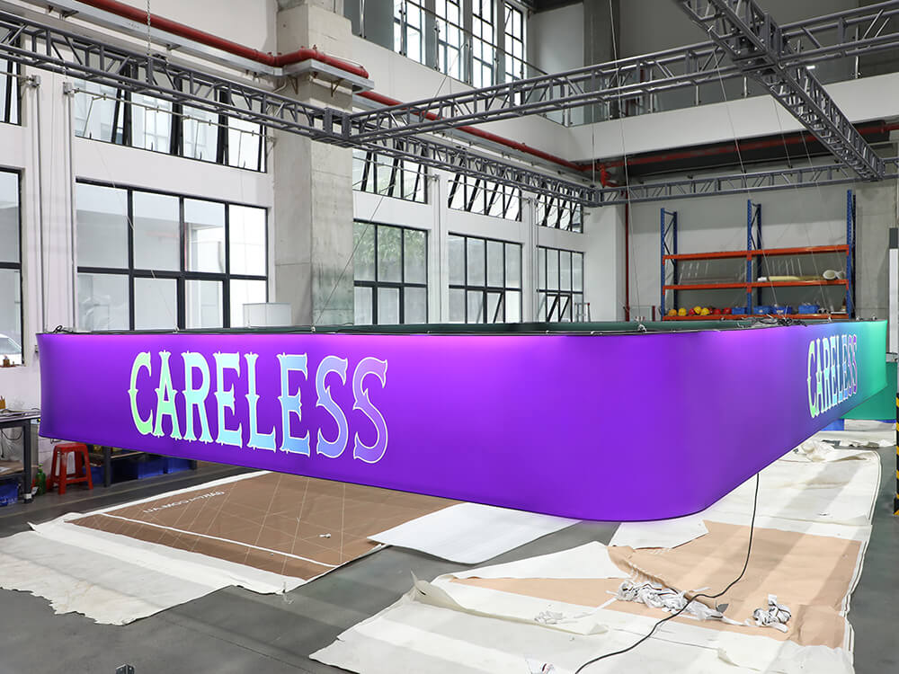 The custom hanging sign frame system for trade shows comes with a harness. The graphic is made of durable dye-sublimated material, which can be washed in a washing machine.