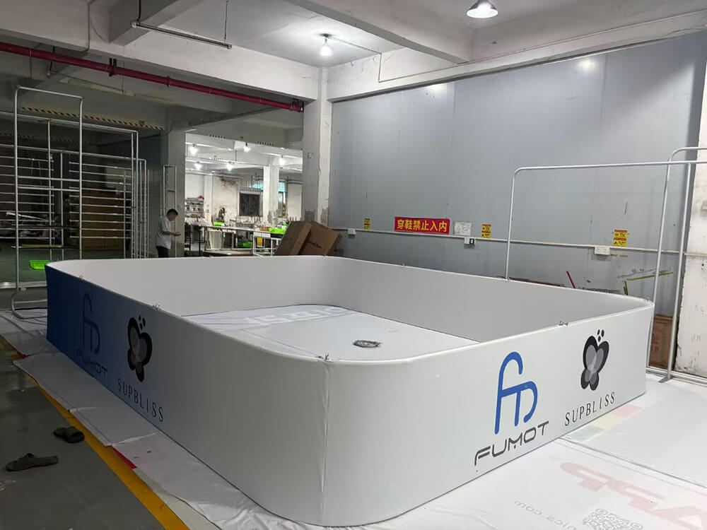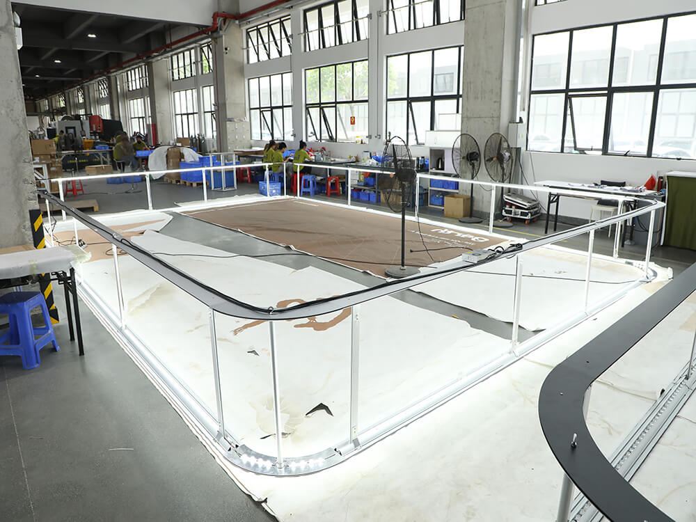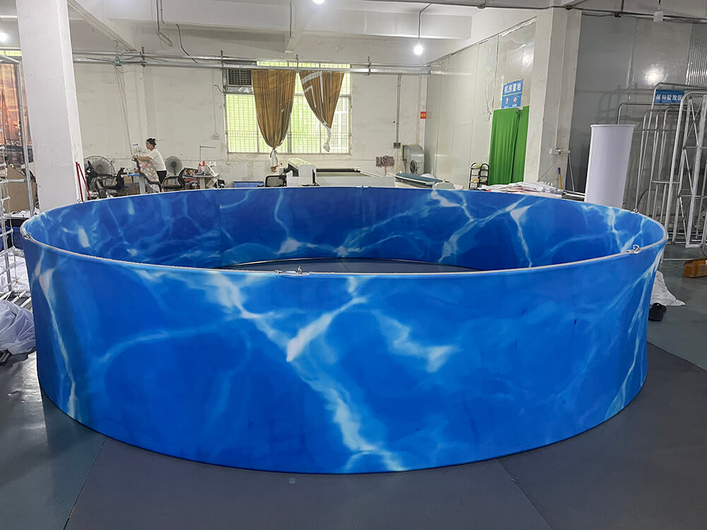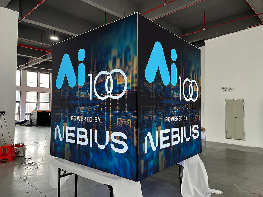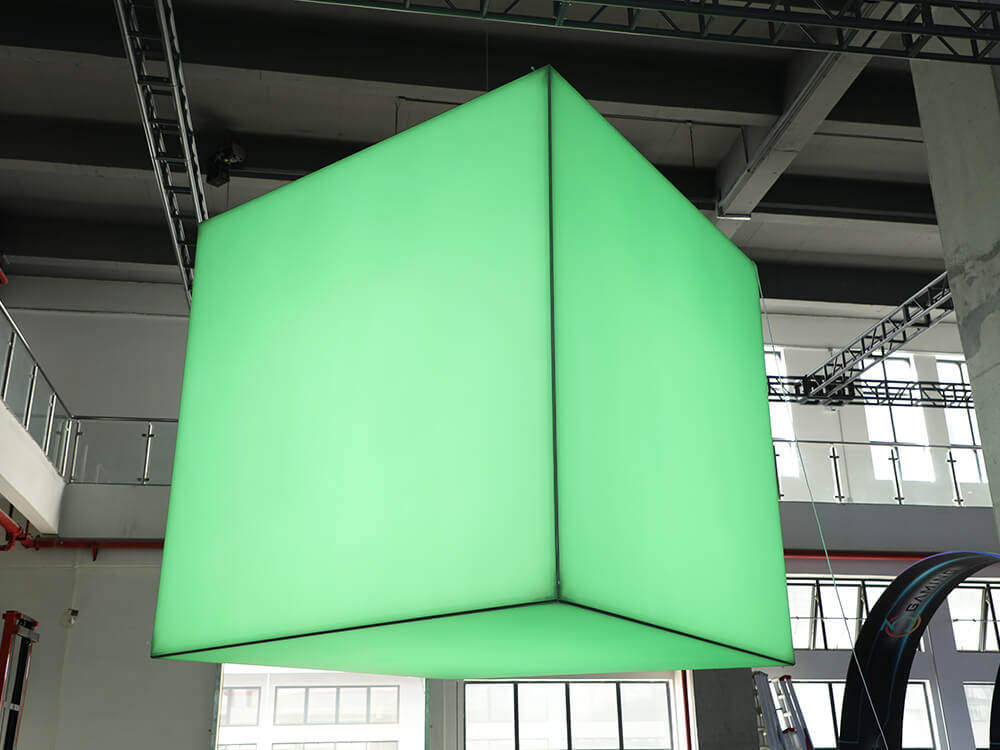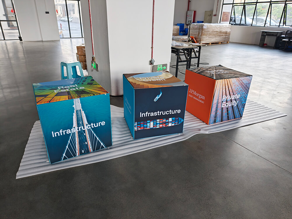 The custom hanging sign frame system for trade shows comes with a harness. The graphic is made of durable dye-sublimated material, which can be washed in a washing machine.